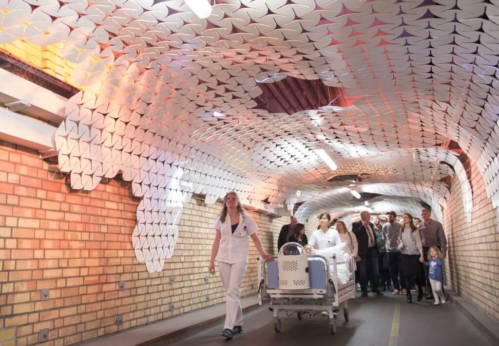 In Zukunft wird ein virtueller Papierflieger mit auf die Reise gehen und seine Bahnen über den Kindern auf einer eigens hierfür entwickelten Wolkendecke ziehen – eine spielerische Inszenierung, die vom Transport zum Operationssaal ablenken und die Fahrt zu einem beruhigenden Erlebnis machen soll. Die Flugbahn des Fliegers wird auf einer Decke aus 800 dreidimensional verformten Wolkenmodulen sichtbar gemacht. Die Intensität der „Tunnelflieger“-Inszenierung nimmt dabei im Laufe der Fahrt durch den Gang ab und gibt so dem Patienten die Möglichkeit, sich fallen zu lassen.